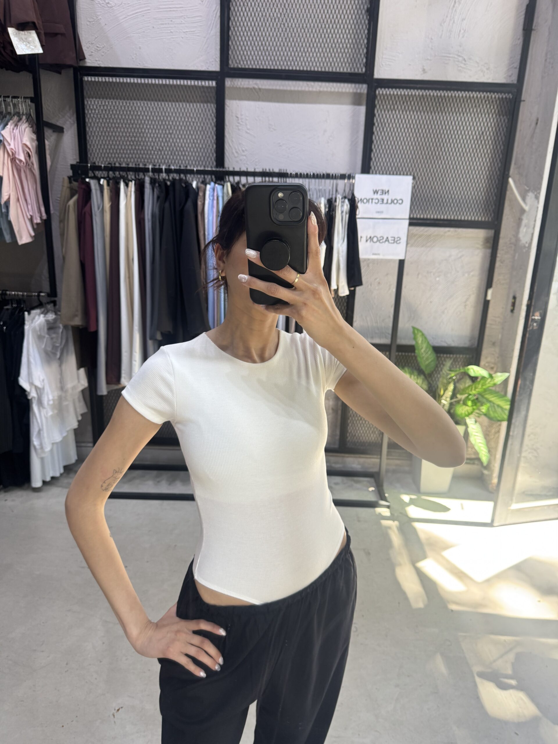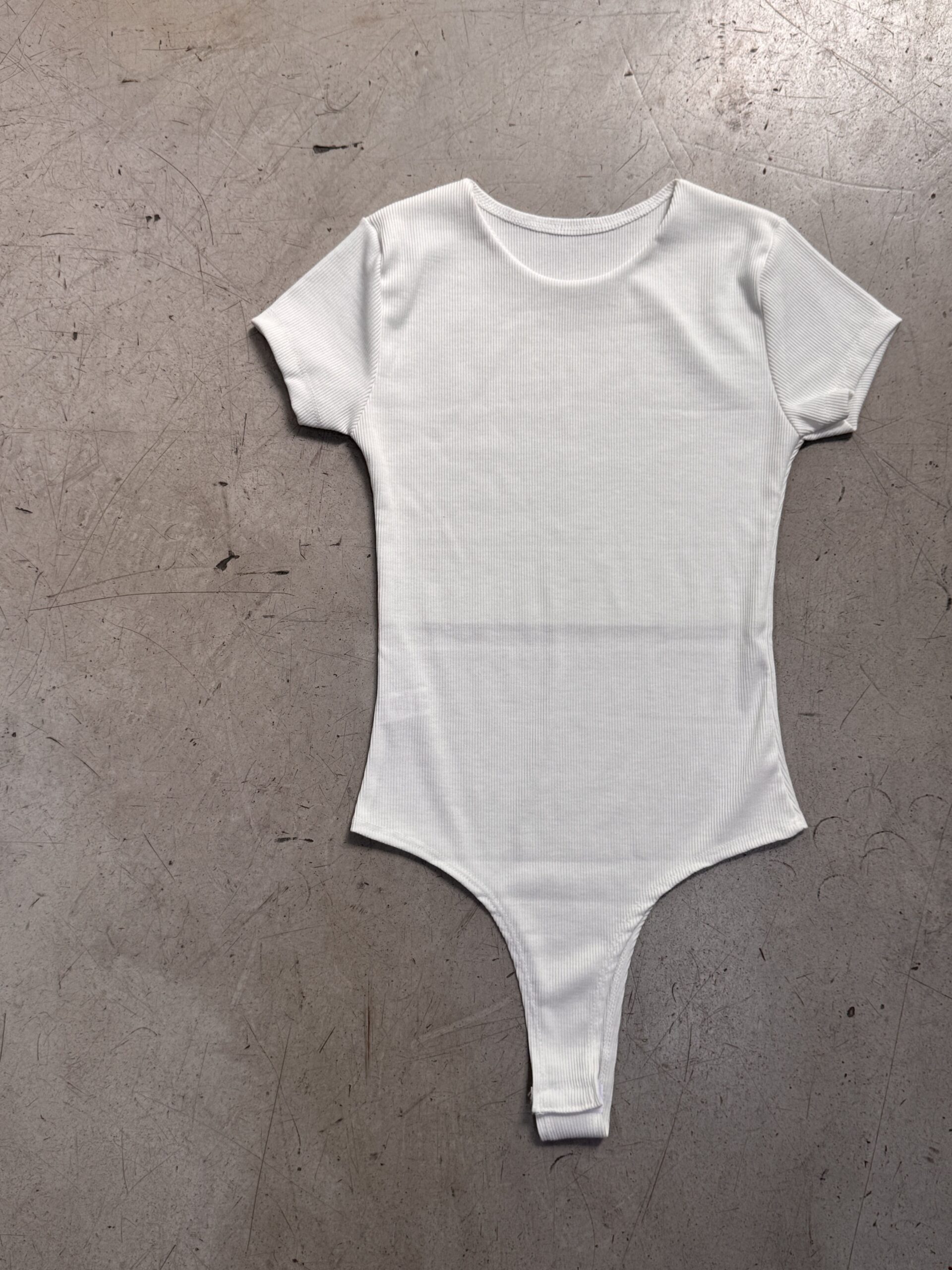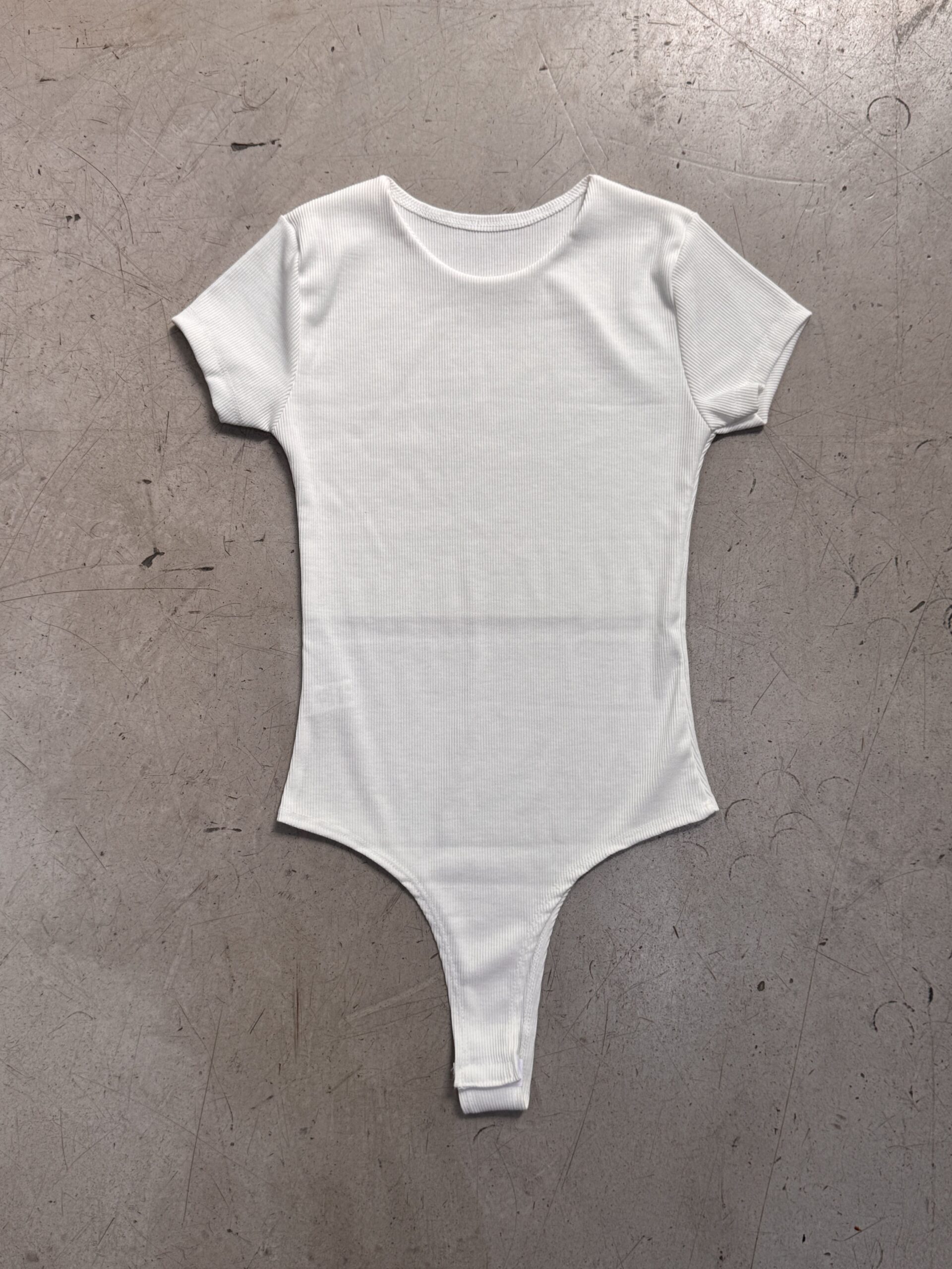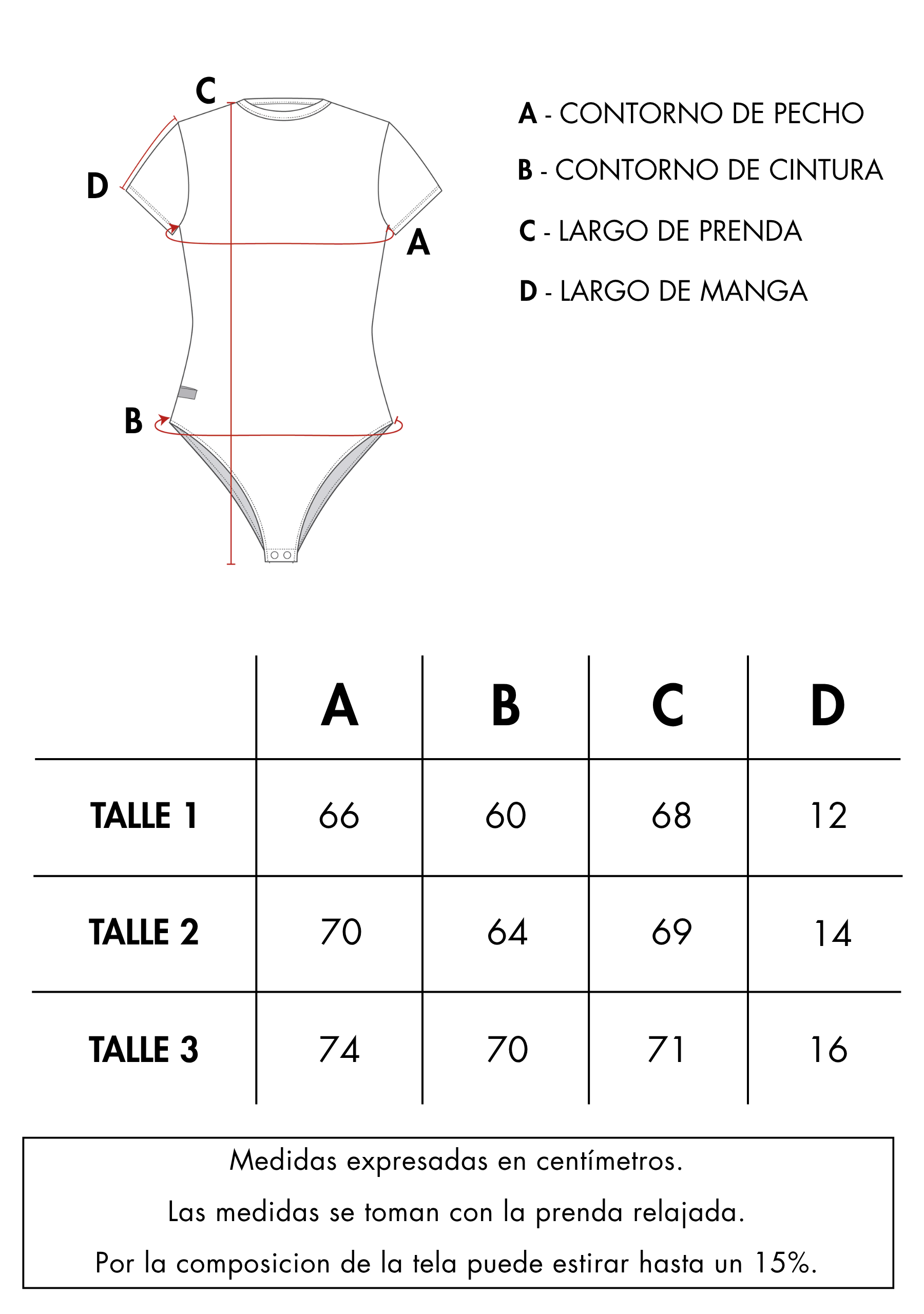 Body manga corta de escote cerrado, cuello redondo. Acceso por broche con botón a presión en entrepierna.