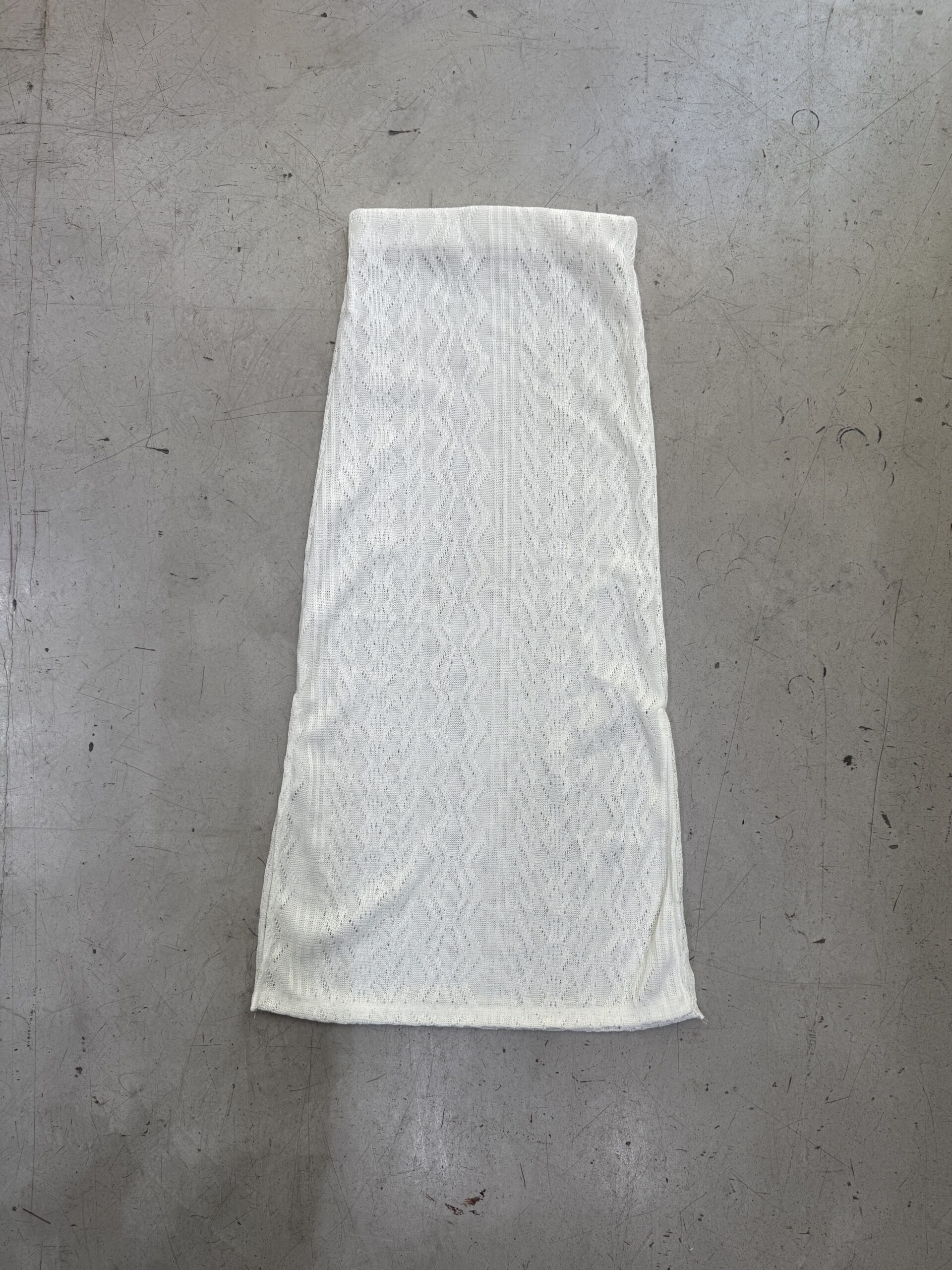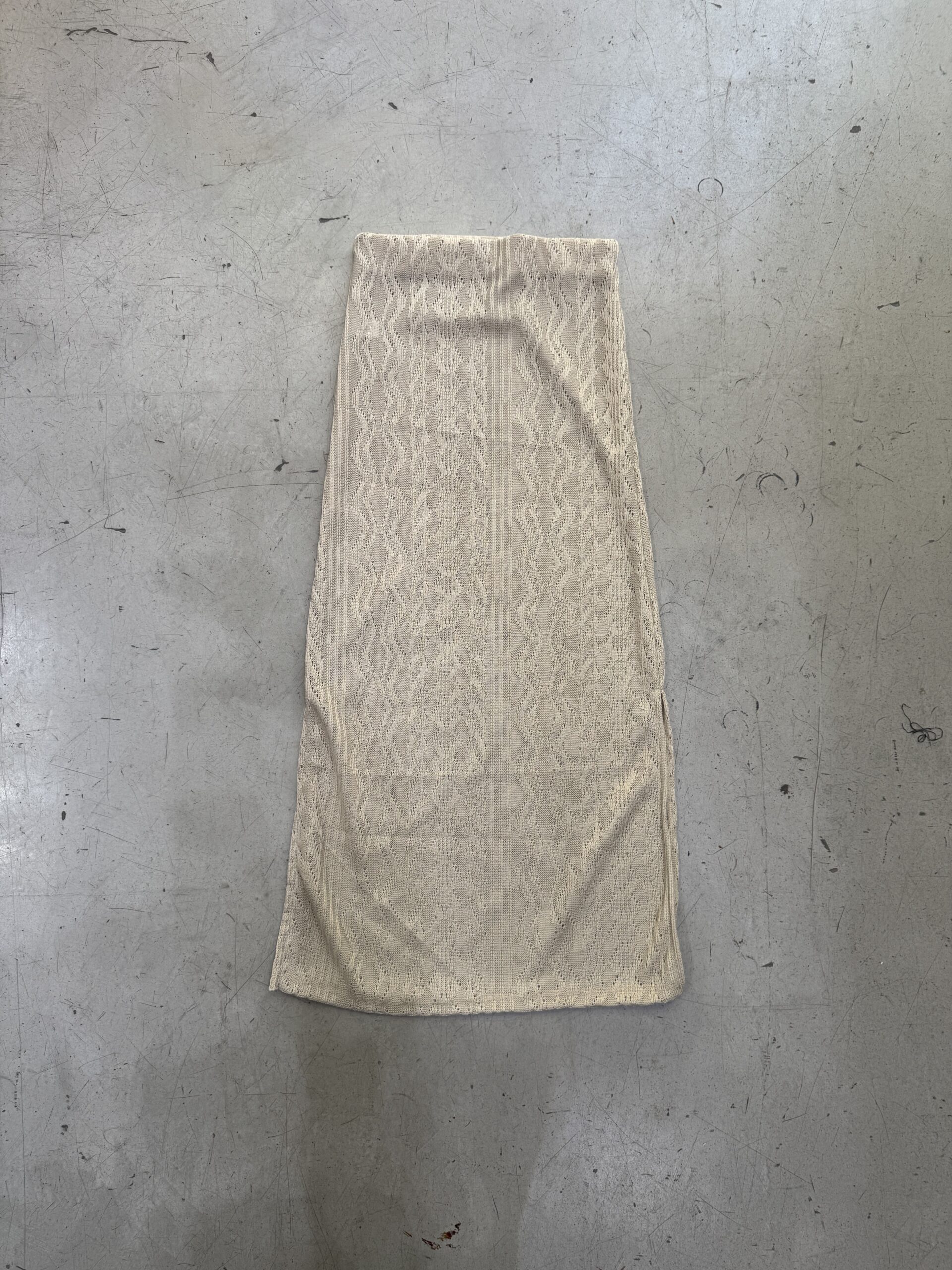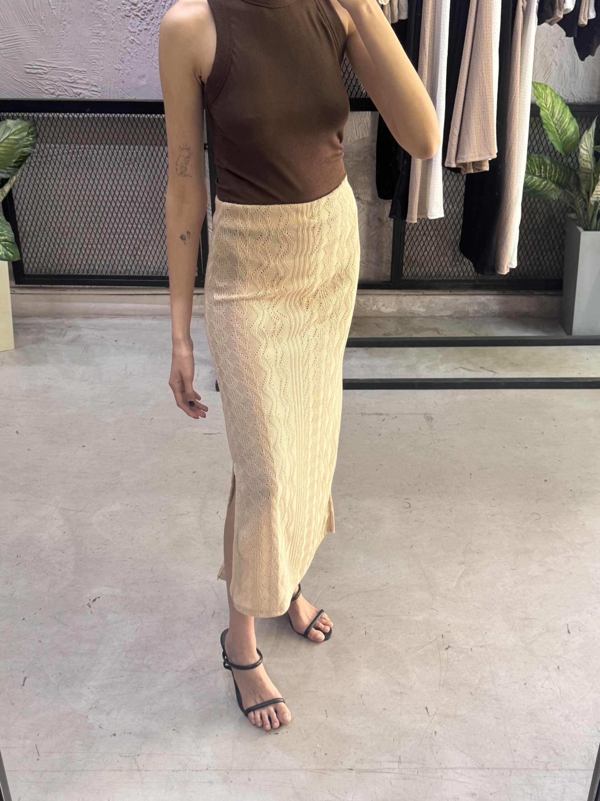 Falda confeccionada en tejido crochet, con tajos en ambos laterales y elástico en cintura.