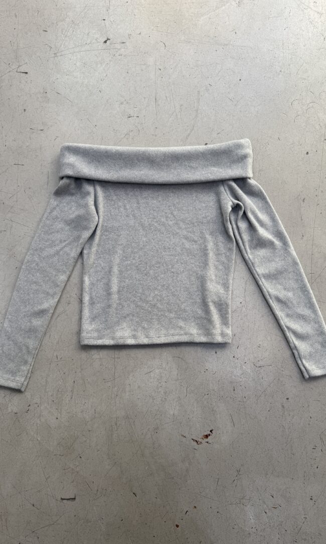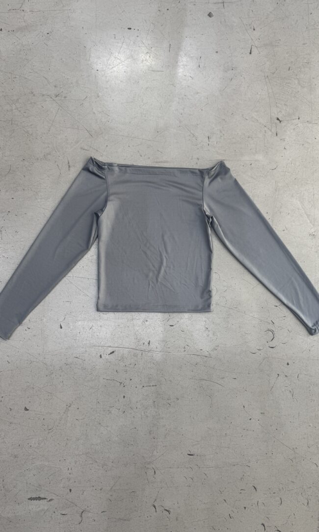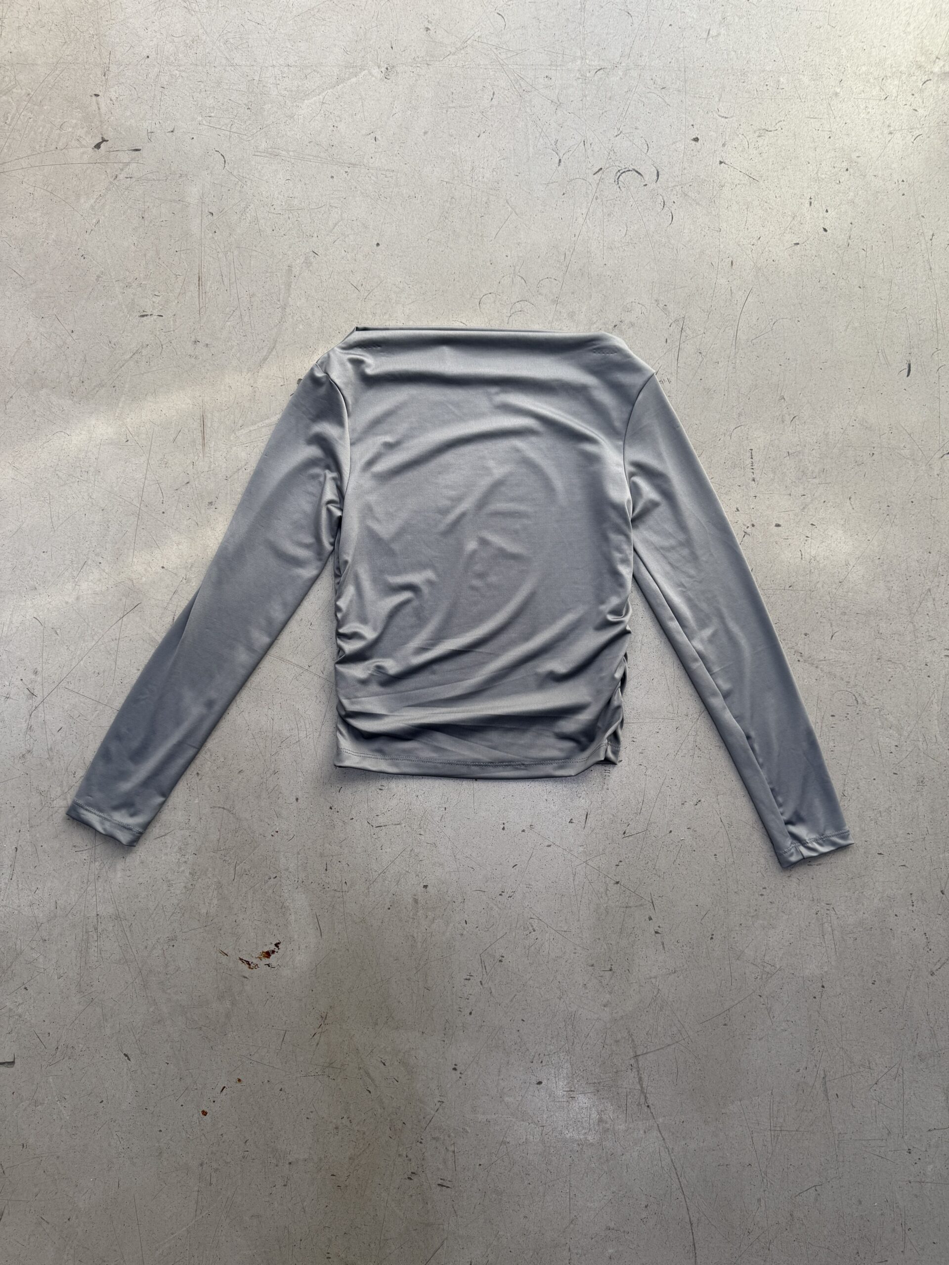 Remera manga larga con cuello estilo bote y detalle de frunces en laterales.