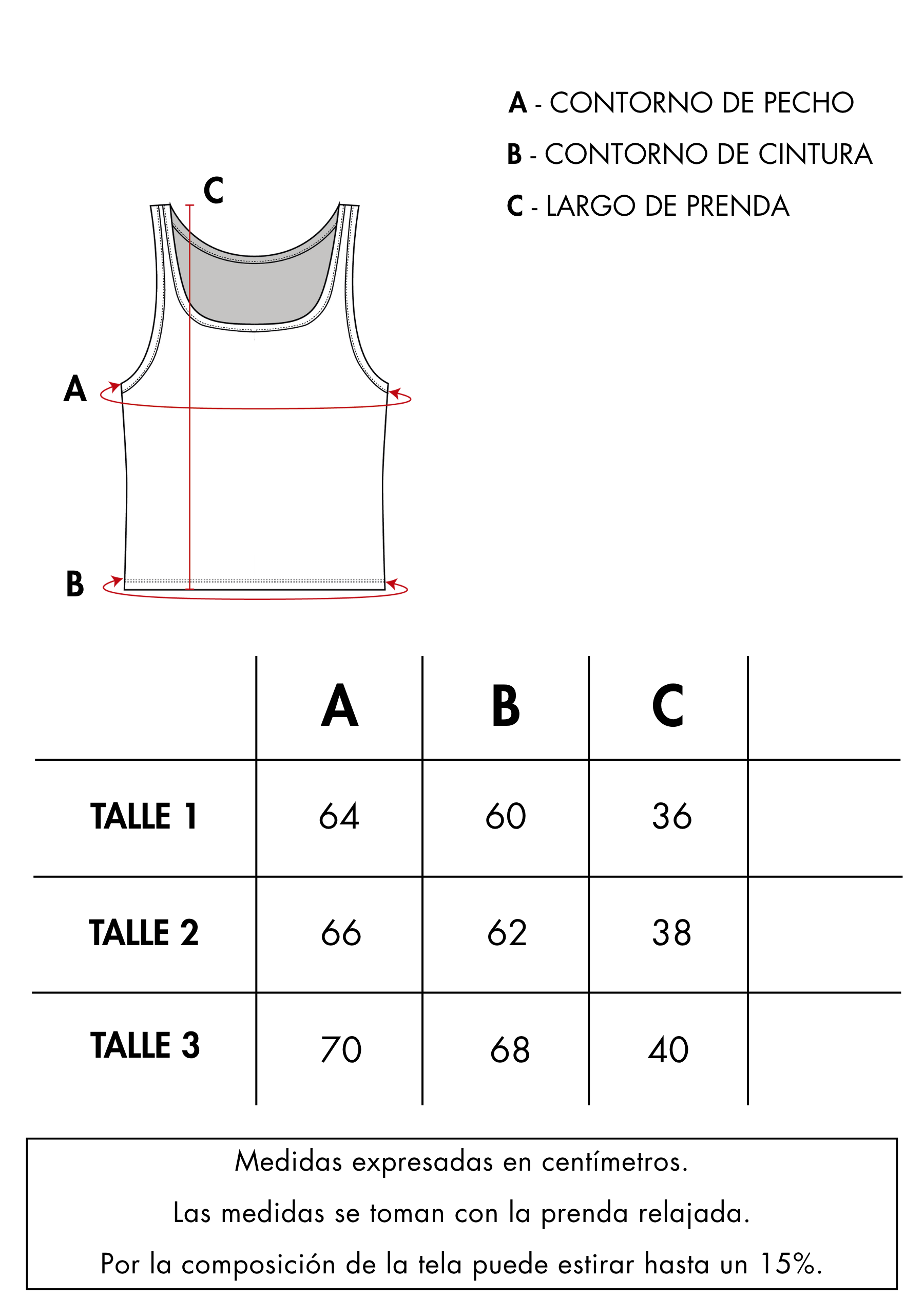 Musculosa de algodón de bretel ancho. Con escote redondo amplio en frente y espalda. Largo a la cintura.