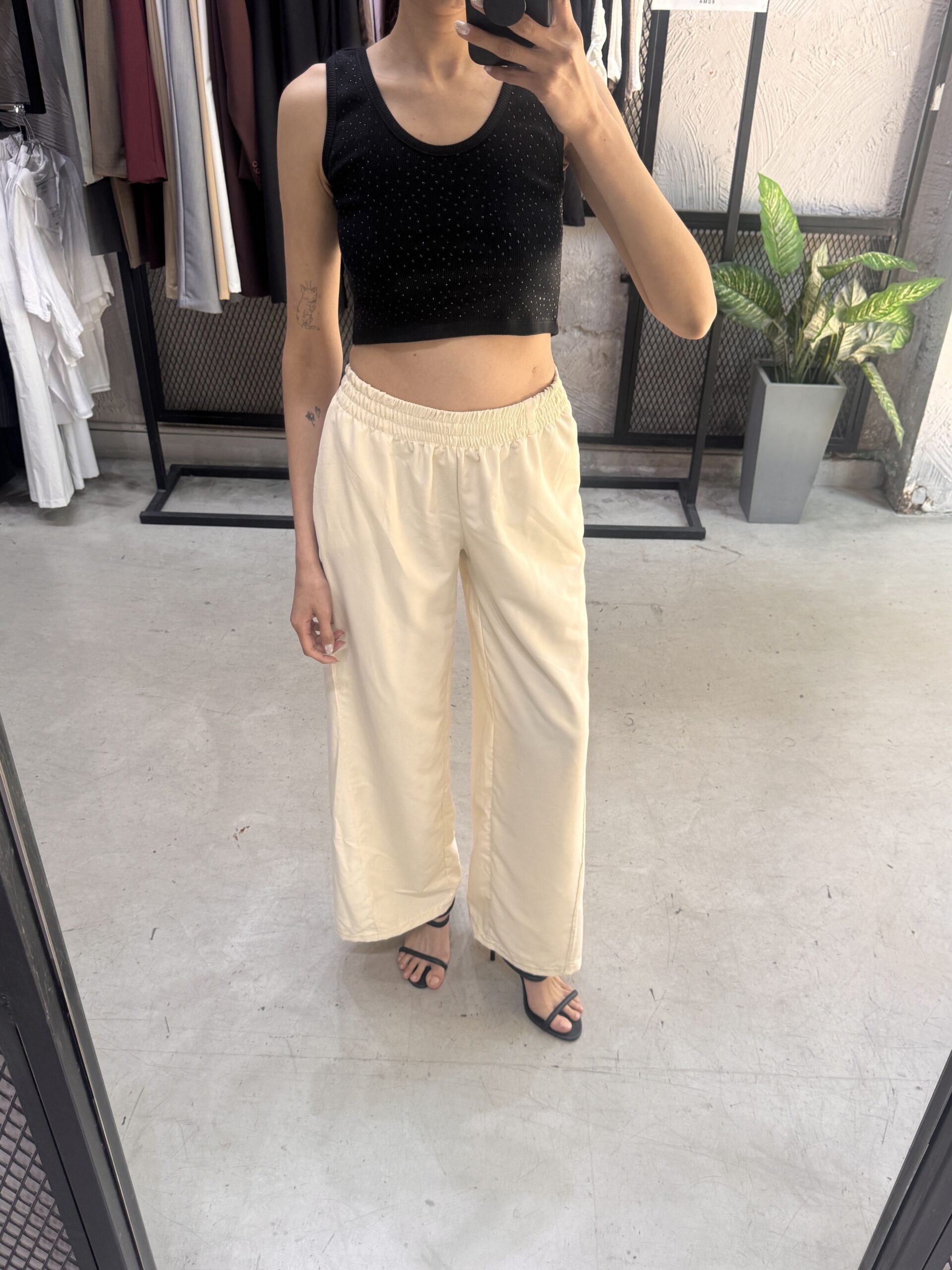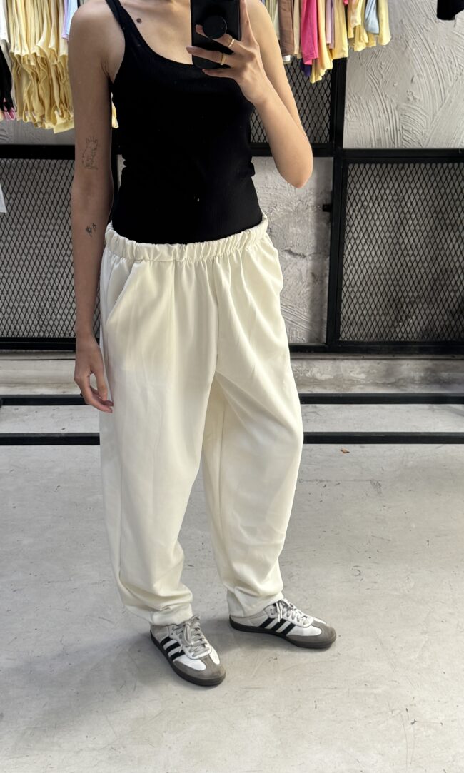 Este pantalón es de estilo oversize, con caída estructurada. Tiene un corte amplio y recto, con piernas anchas y largas que terminan justo por encima del tobillo. Con cintura elástica fruncida, bolsillos y detalle de costuras verticales a los lados.