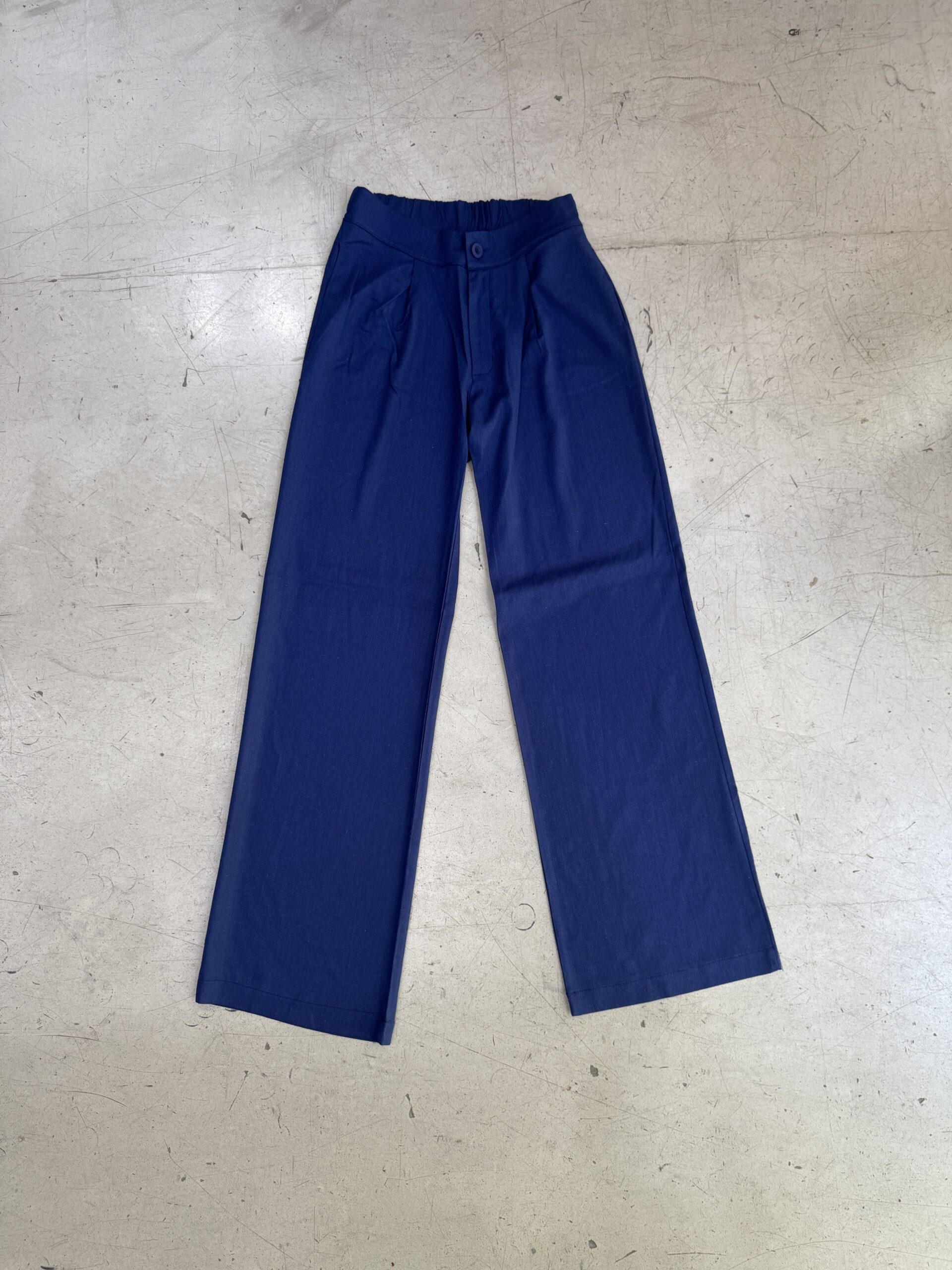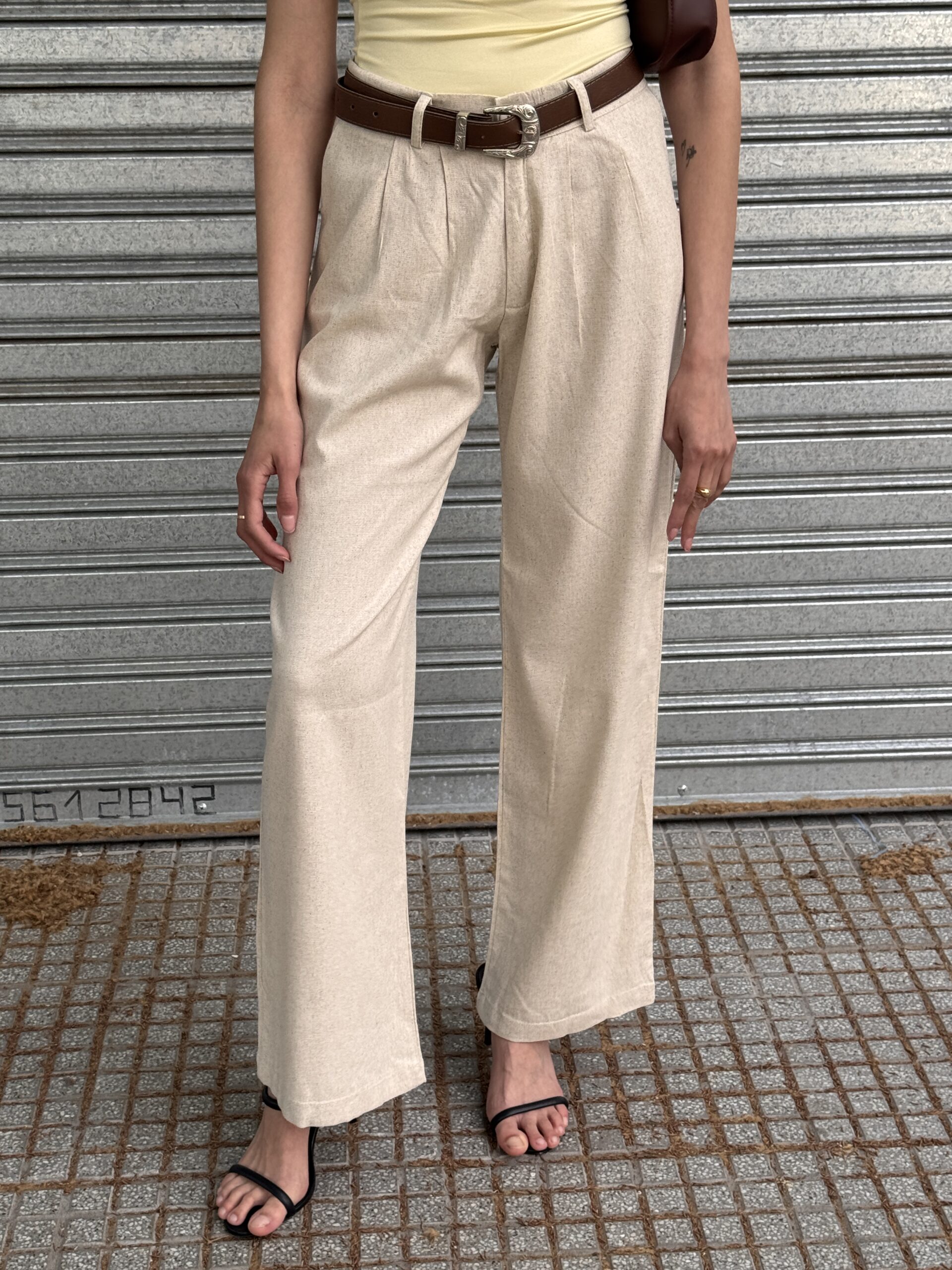 Pantalón de lino sastrero con elástico en cintura trasera, bolsillos laterales, cierre y botón a tono. Corte recto.